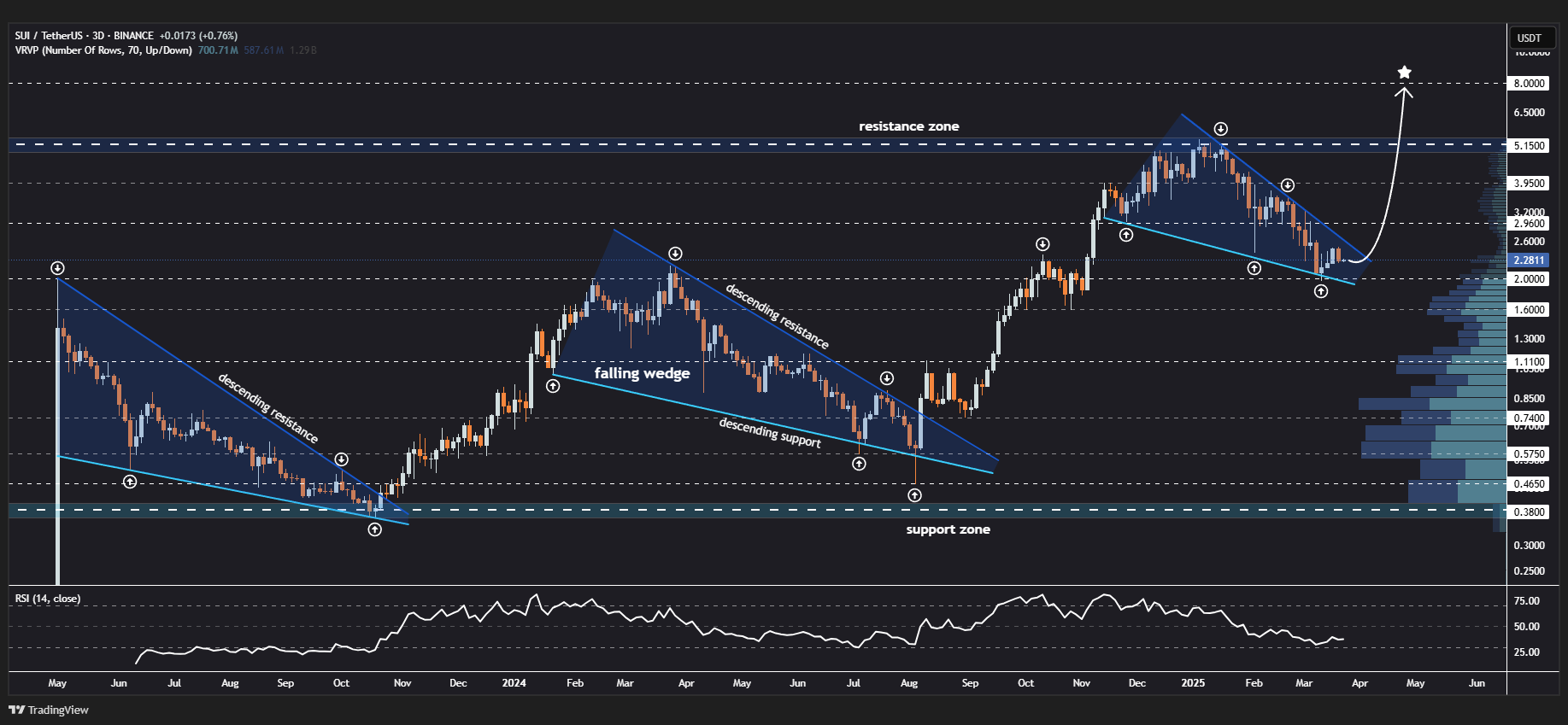 目前,SUI在2.28美元水平附近盘整,价格遵循楔形的下趋势线。如果这种模式像以前一样发挥作用,突破下降阻力可能会引发一轮主要的上涨,目标指向3.95美元和5.15美元的关键阻力位。成功突破这些水平可能为长期内尝试突破8.00美元的历史新高奠定基础。