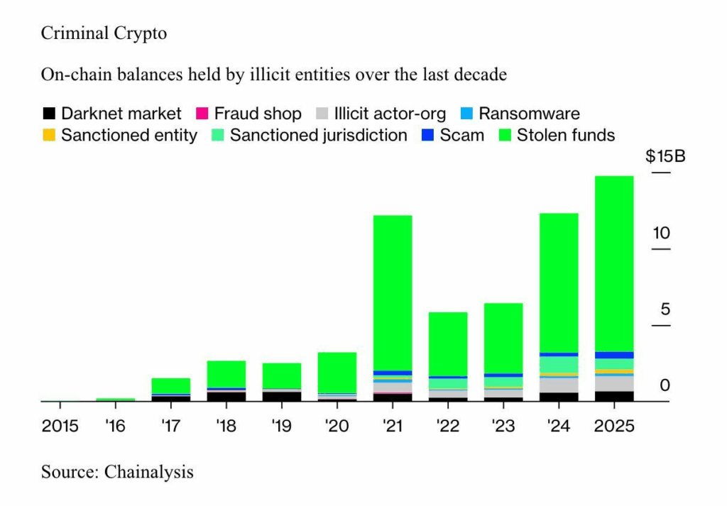 区块链分析公司Chainalysis研究显示,各国政府可能持有价值750亿美元的战略性比特币及加密资产储备。涉及非法活动的加密资产 | 来源:Chainalysis