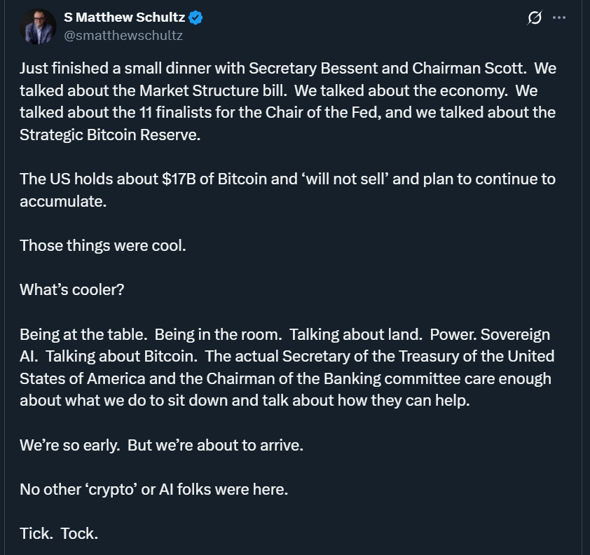 据报道,美国财政部长斯科特·贝森特证实政府目前持有170亿美元比特币。贝森特在与CleanSpark首席执行官S·马修·舒尔茨的私人晚宴中,还透露了增持比特币的计划。美国战略比特币储备会谈 | 来源:S Matthew Schultz