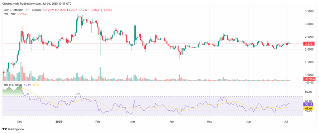 撰稿时,XRP的相对强弱指数(RSI)约为53,显示价格动能正转向买方市场,这可能为未来几日潜在上涨提供助力。
