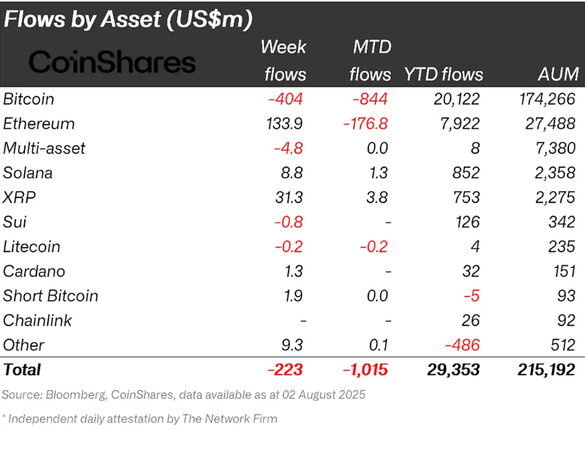 过去几周美国现货以太坊ETF持续录得显著资金流入。尽管8月1日全球加密货币市场暴跌时曾出现1.523亿美元资金外流,但CoinShares最新报告显示,上周以太坊仍吸引强劲资金流入。
