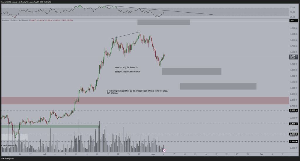分析师Michael van de Poppe近期在X平台发文指出,以太坊当前的"反弹"尚缺乏说服力。但他表示,若ETH价格能守住3,537美元支撑位,短期内可能突破4,100美元。若因地缘政治和宏观经济困境进一步回调,他认为2,700美元将构成重要支撑。
