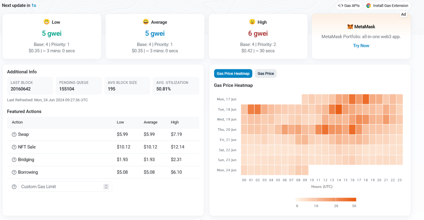 截至2024年6月21日,以太坊网络的平均Gas价格已降至7.32 Gwei,较今年早些时候的高位显著下降。这一降幅使以太坊网络对开发者和用户都变得更加经济实惠。值得注意的是,这一价格变化发生在网络活动保持高水平的背景下。根据L2Beat的数据,6月21日以太坊Layer 1和Layer 2协议平均每秒处理299笔交易。