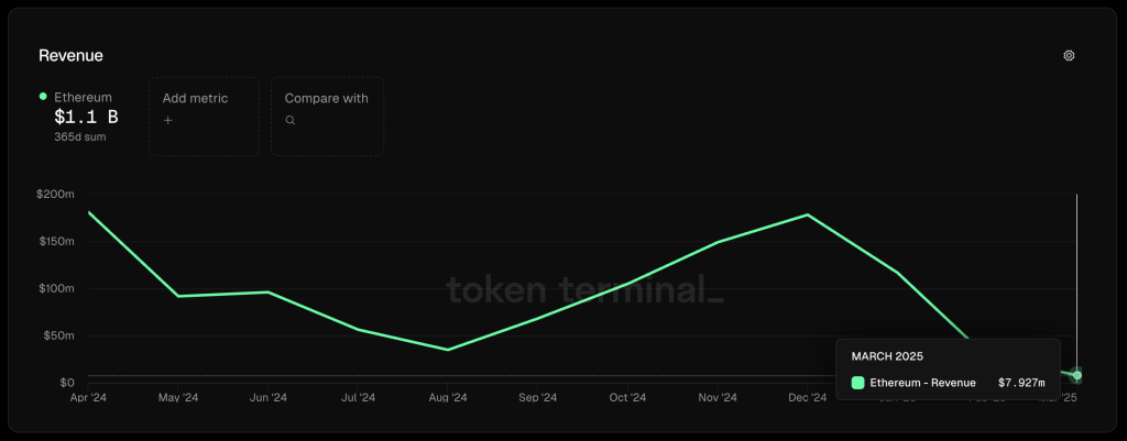 2025年,以太坊网络的收入也经历了急剧下降。1月,以太坊的月收入为1.166亿美元,但到2月,这一数字已暴跌至2710万美元。截至3月,收入进一步下降,注册不足800万美元。
