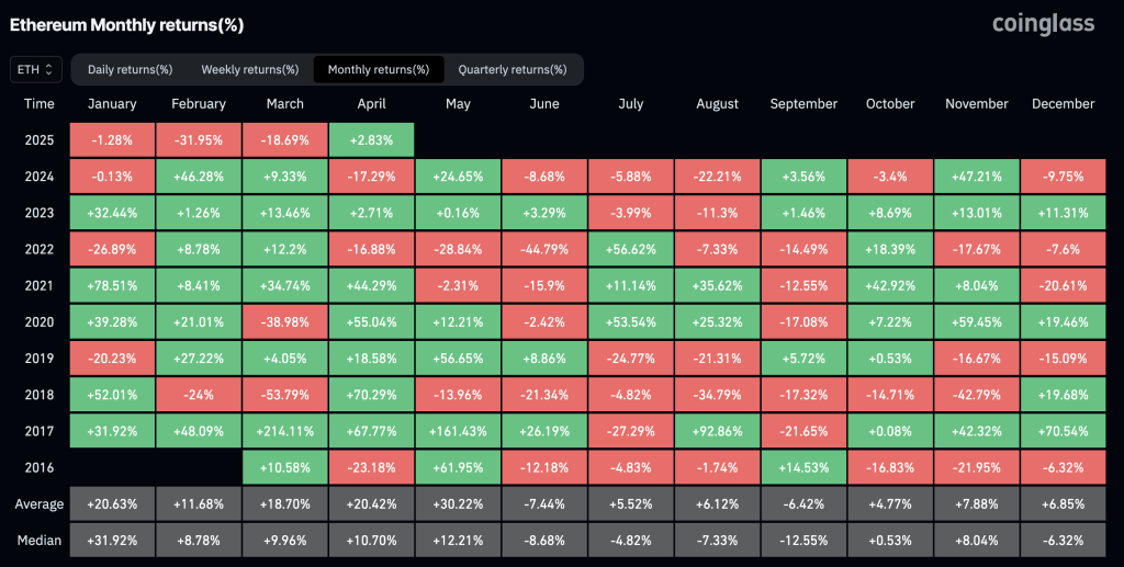 除了以太坊交易费用的大幅下降外,该代币的表现也不佳,经历了一个季度的严重价格下跌,这在比特币减半后加密市场经历牛市时非常罕见。根据下表的数据,我们可以看到ETH的2月跌幅接近32%,这令持有者感到沮丧。