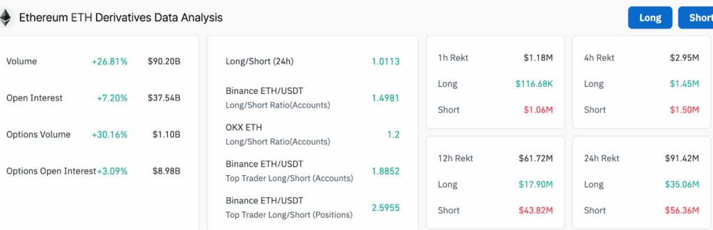 衍生品市场未平仓合约量和交易量同步上升。据Coinglass数据,ETH期权未平仓合约达89.8亿美元,日交易量增长30%至11亿美元。期货和期权交易活动反映出月度交割日前市场参与度提升。