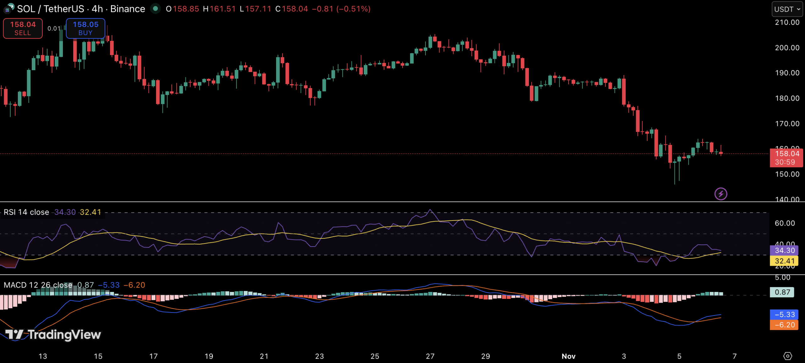 Solana交易价格为158.11美元,过去24小时下跌0.42%,上周下跌15%,市值为873亿美元。其RSI为34,显示出强烈的看跌势头,而MACD虽然仍为负值,但开始趋平,表明早期企稳迹象。