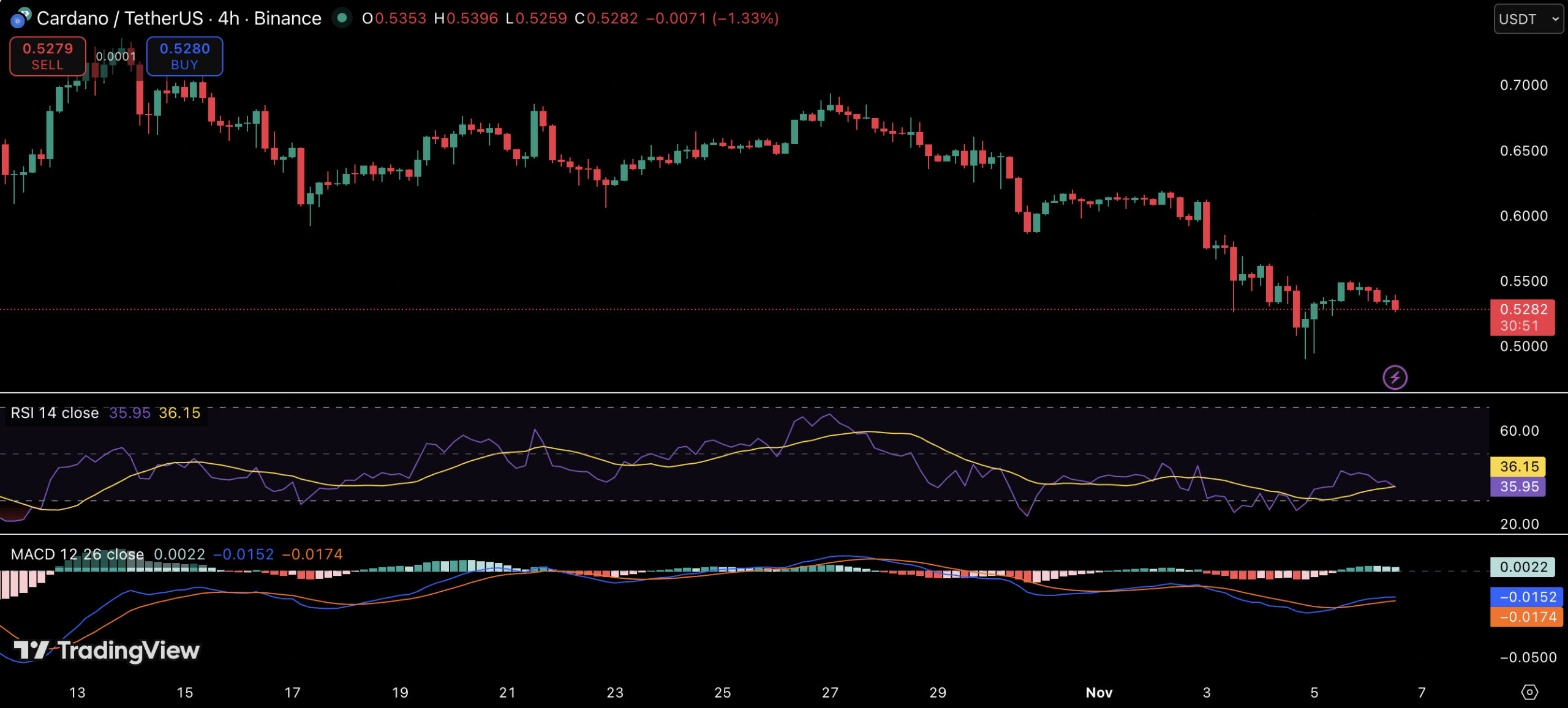 Cardano的ADA目前交易价格为0.528美元,过去一天下跌2.6%,本周下跌12.8%,市值接近189亿美元。技术指标显示RSI约为36,MACD持平,表明持续疲软和动能有限。