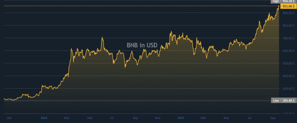 过去一年间,BNB实现了竞争币领域最强劲的复苏之一,从年度低点205.48美元暴涨至逼近千元大关。这一陡峭攀升轨迹充分展现了结构性需求与市场定位如何推动价格持续增长。