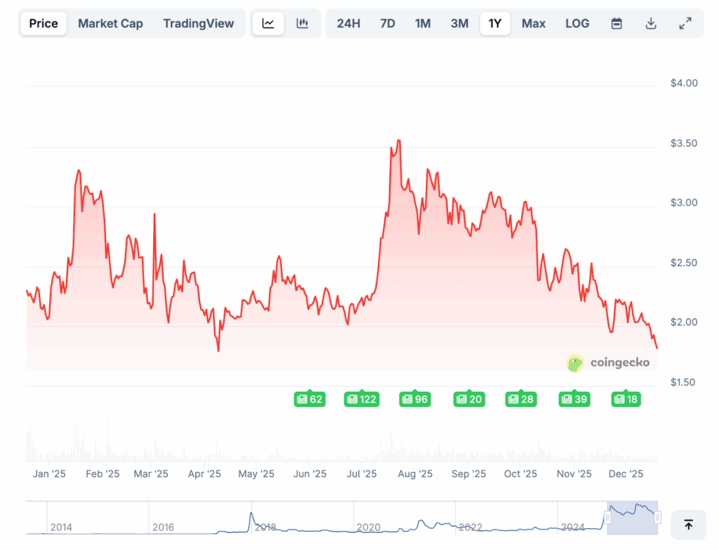 XRP的价格走势与区块链支付结算领域的新兴关注度密切相关。银行发行稳定币凸显了XRP致力解决的问题——跨机构、跨边境的高效价值转移。技术分析显示该代币仍处于长期积累结构,若2026年机构采用率持续提升,XRP价格有望达到2.5至3美元区间: