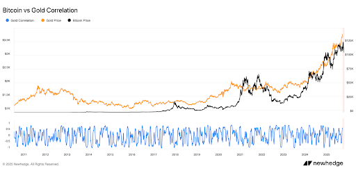 Newhedge数据显示,比特币价格从2010年近乎零值飙升至2025年的12.5万美元,而黄金价格多年来从约1,000美元缓慢攀升至3,000美元以上。