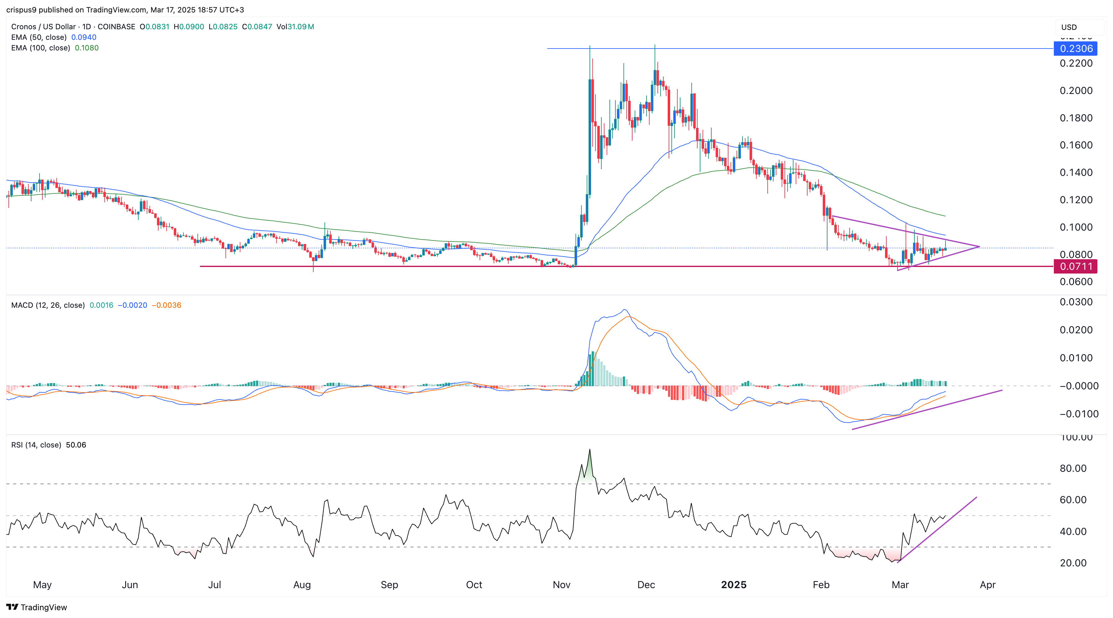 Cronos还在0.0710美元处形成三重底形态。自2024年以来,价格已三次未能跌破该水平。因此,如果价格能守住0.0710美元支撑位,则可能很快反弹。若如此,下一个目标将是位于0.1080美元的100日移动平均线,较当前水平高出约30%。如果价格跌破0.0710美元的三重底形态,则看涨前景将失效。