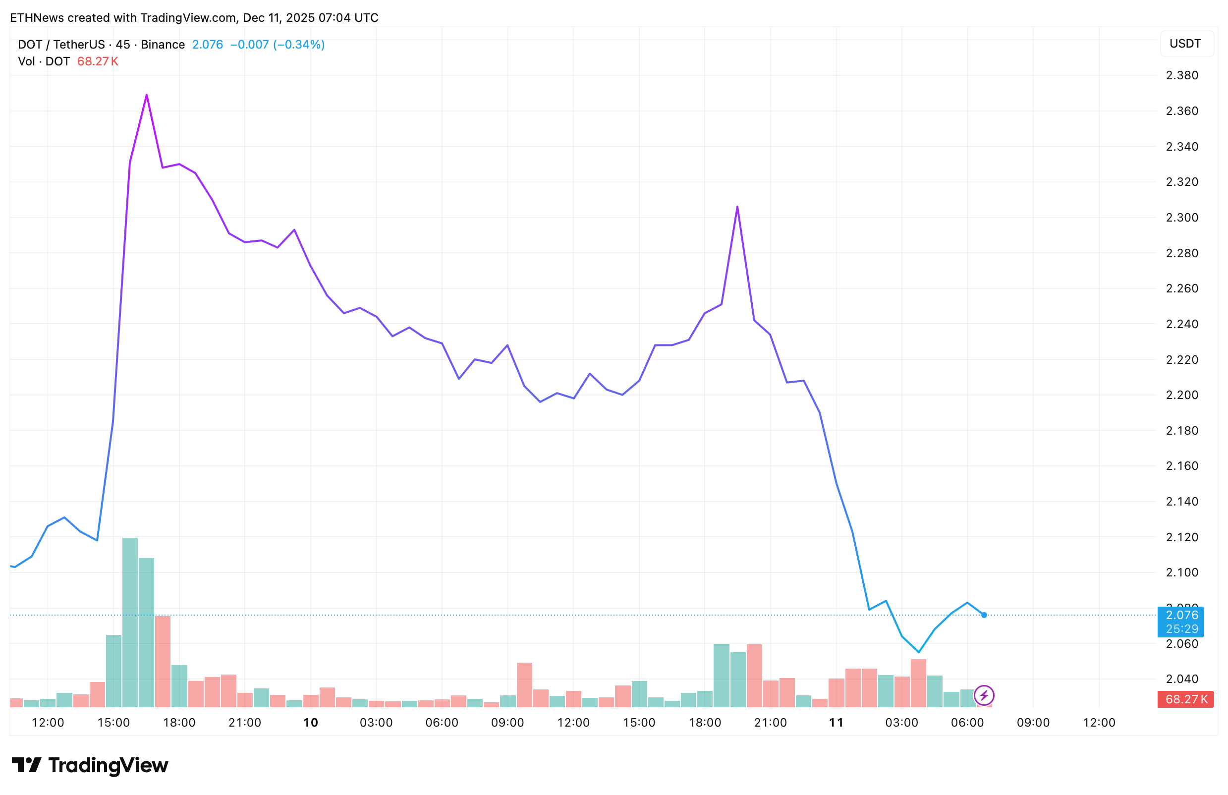 图表显示DOT曾短暂冲高至2.30美元上方,随后急剧反转跌向2.05-2.10美元区域,目前正在该区域趋于稳定。日内波动剧烈:早盘拉升期间成交量放大,随后在下跌过程中随着卖家入场而出现决定性转变。