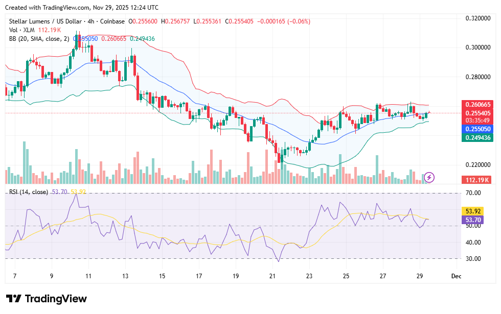 恒星币XLM于4小时图内在0.25至0.26美元窄幅震荡