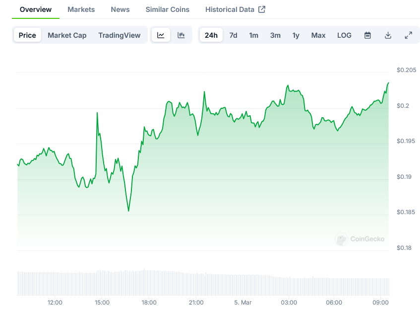 在技术面上,DOGE在0.1826美元处建立了近期低点,并显示出盘整迹象。价格走势突破了小时图上的看跌趋势线,阻力位在0.1900美元,暗示有复苏的潜力。
