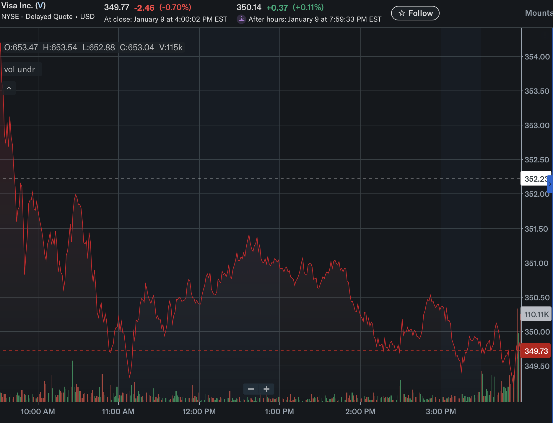 在特朗普总统宣布从2026年1月20日起将信用卡利率上限设定为10%为期一年的提议后,Visa公司的股价保持了相对稳定。尽管这一声明给整个金融领域带来了新的政策不确定性,但分析师普遍认为,Visa的核心商业模式并未受到直接监管冲击。Visa股价收于350美元附近,日内的波动更多反映了广泛的市场辩论,而非公司特定风险。市场反应平淡表明,随着政策讨论的展开,投资者正在区分信贷发行机构和支付网络。