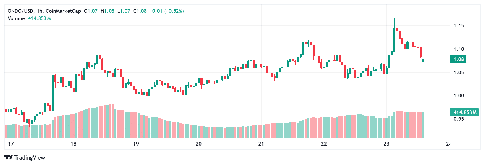 最新研报指出:"ONDO ETF申请提供了强有力的突破叙事,短期目标价看至1.25美元,若动能持续或将测试1.35美元。"