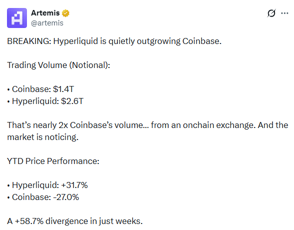 Hyperliquid交易量超越Coinbase