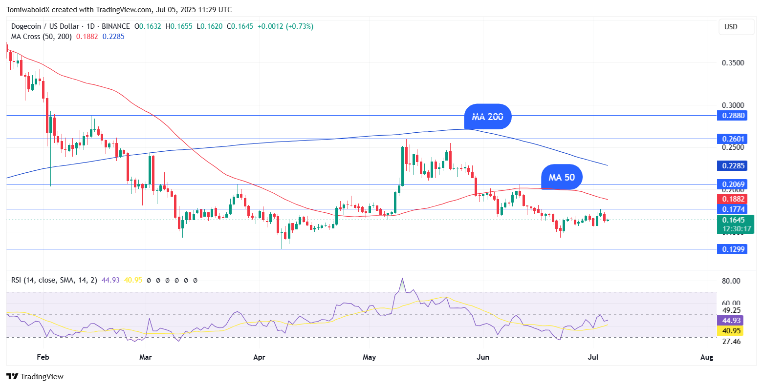 本周早些时候该加密货币持续攀升,最终以0.175美元的看涨收盘价收官。但触及该高点后不久,DOGE在7月4日短暂回调至0.161美元低点,随后小幅反弹。