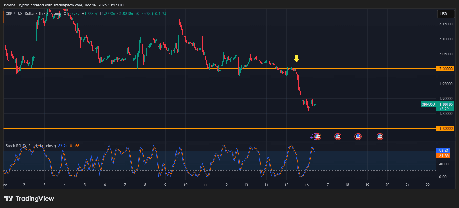 在多次尝试守住2美元关口未果后,XRP已正式失守这一重要心理价位。价格走势明确拒绝了2美元区域,使原本的支撑位转化为强劲阻力。