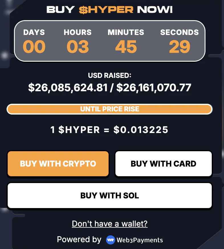 比特币超能链($HYPER)预售已突破2600万美元,过去24小时内巨鲸追加投资23.9万美元。