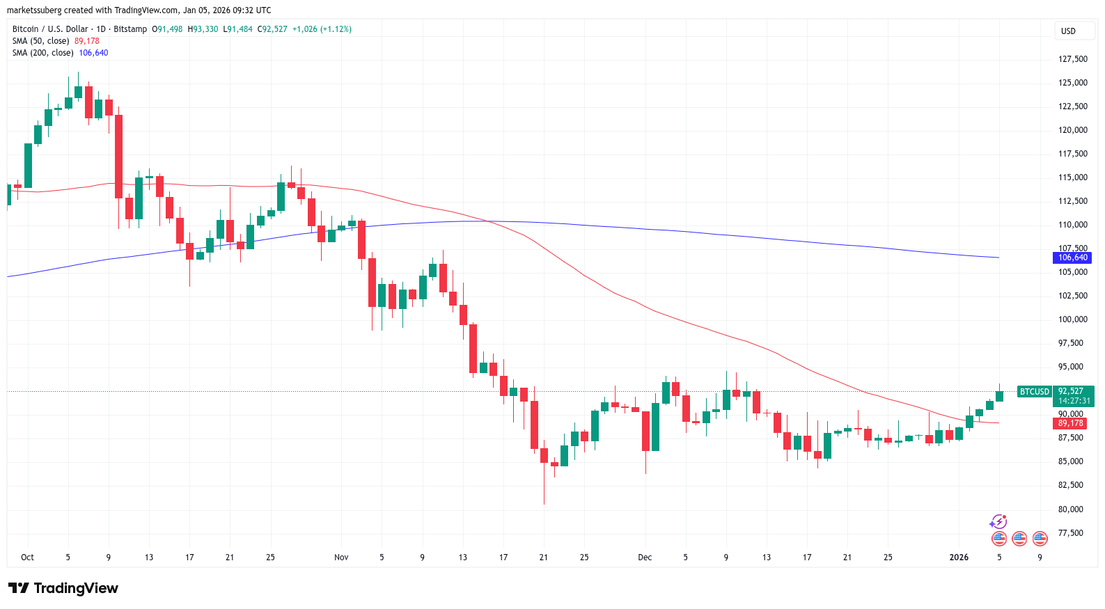 比特币本周终于为多头带来喘息之机,在地缘政治事件影响下呈现积极走势,但这一态势能否延续?随着BTC/USD自12月11日以来首次触及93,000美元,该问题正引发交易员与评论员的密切关注。数据显示比特币过去五日累计涨幅达6.6%。