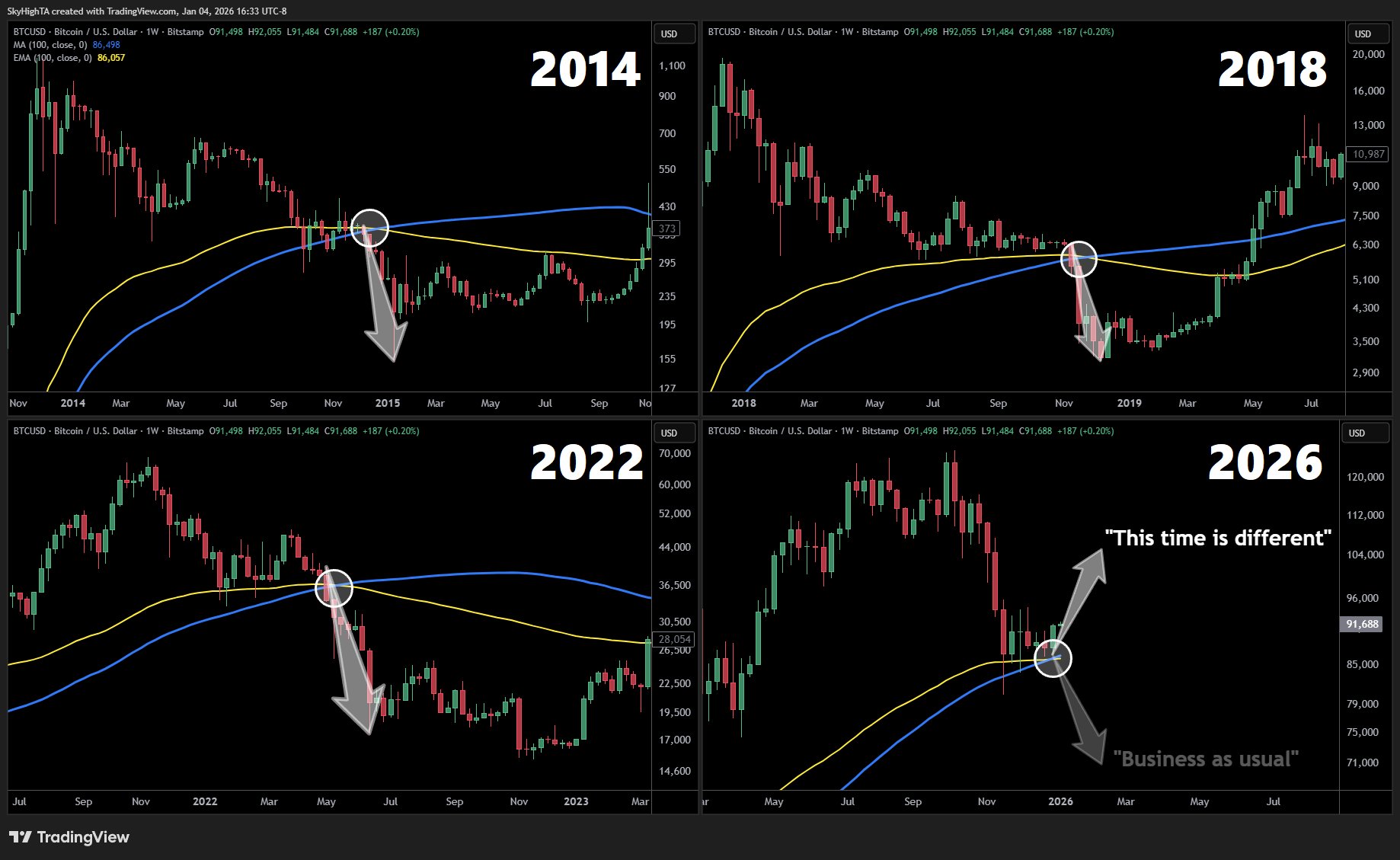 从更长周期观察,交易员SuperBro指出周线100周期EMA与SMA已同步转绿。历史数据显示,此前比特币熊市中该均线交叉往往伴随大幅下跌,但2026年走势呈现显著差异。“历次周期中该交叉出现后数周内价格均暴跌50%以上直至周期底部,”他在分析中强调,“当前走势与前周期呈现前所未有的看涨背离。”