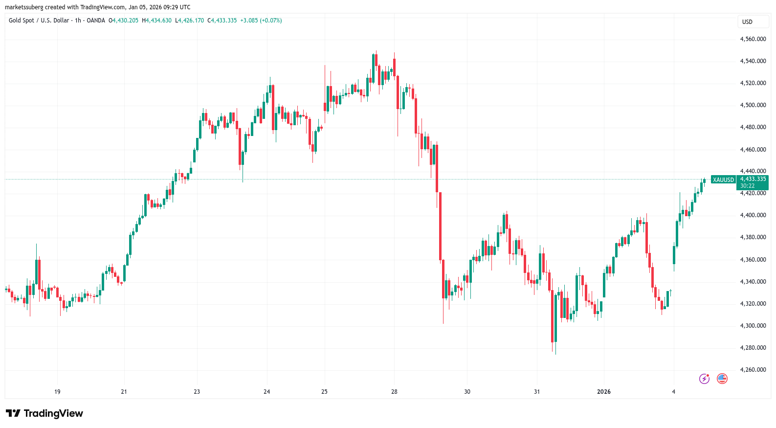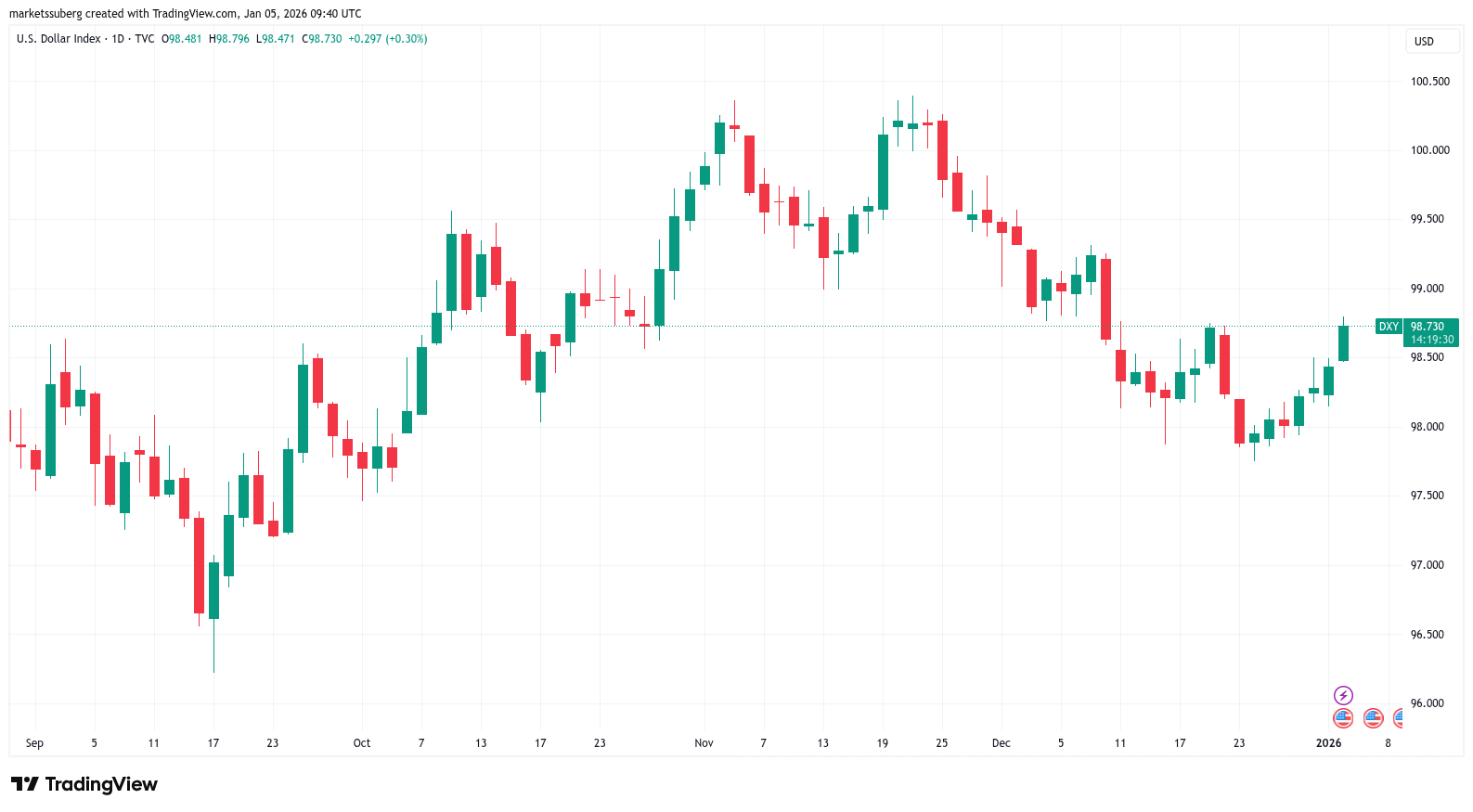更值得关注的是其与黄金白银等避险资产重现同向波动。现货黄金周一早盘上涨2%,逼近12月创下的每盎司4,450美元历史高点。与此同时,潜在的地缘政治影响推动美元指数逼近近一月高位。