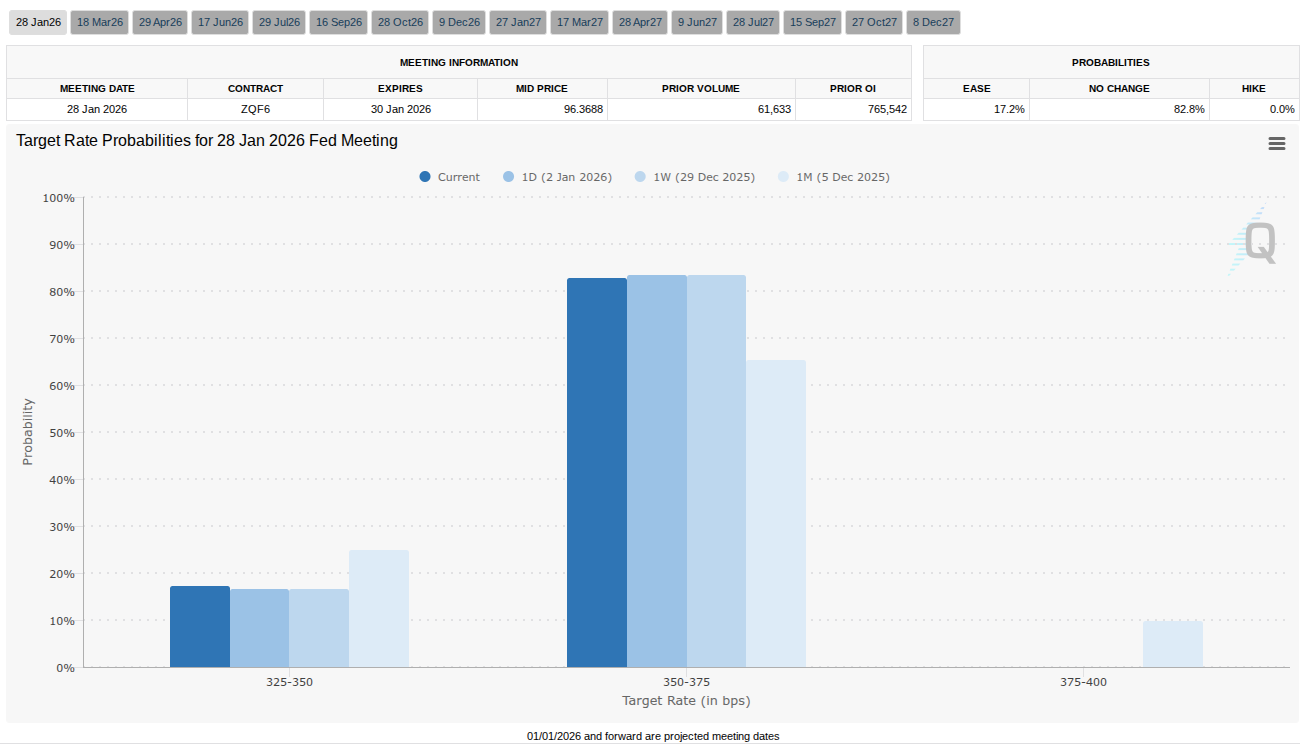 2026年首个完整交易周将迎来多项美国关键经济数据。就业趋势成为关注核心,这些数据发布之际劳动力市场持续承压。这对将于1月28日议息的美联储构成政策挑战,虽然风险资产欢迎降息,但市场情绪尚未支撑这一预期。最新联邦基金利率期货数据显示,本月降息25基点的概率仅为17.2%。