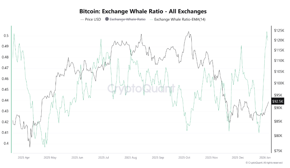 监测平台同时警示买入力量未能匹配流入规模,稳定币净流量基本持平。“大部分活动反映内部转移,而非新增资金入场,”报告补充称。另一份分析显示交易所鲸鱼比率的两周移动平均线已升至2025年3月以来最高水平。“历史上此类动向往往是抛售与供应压力增加的前兆。”