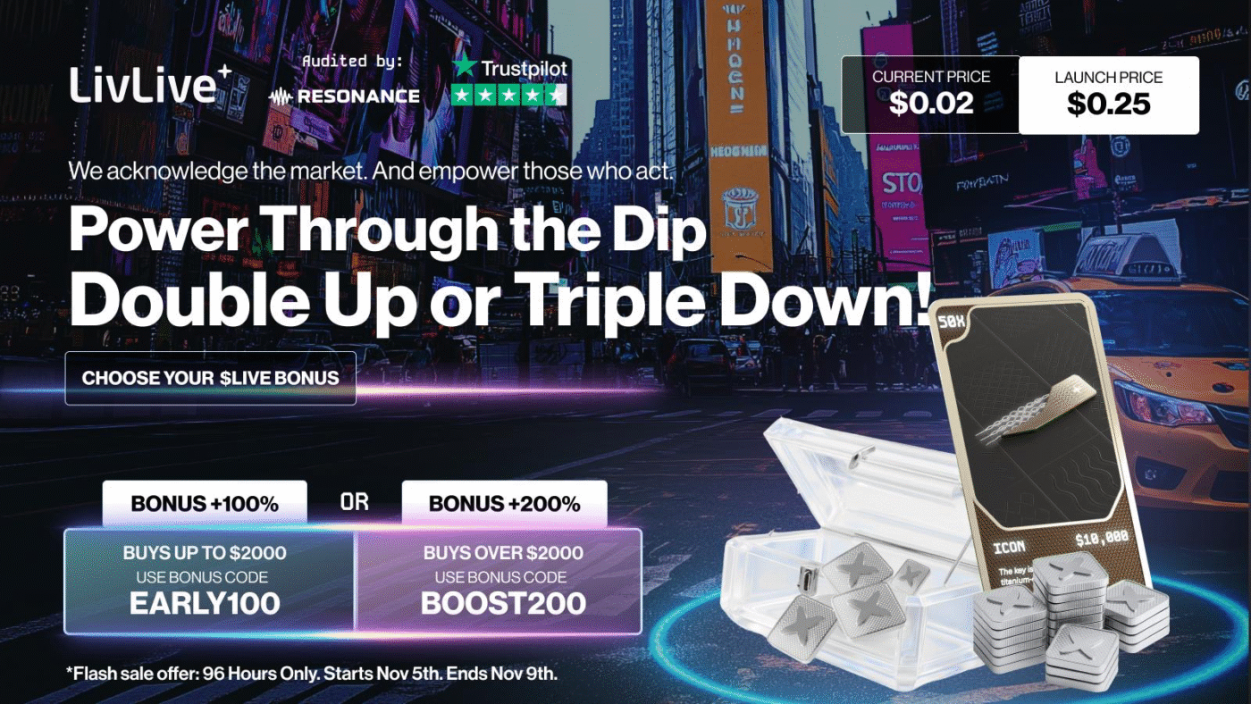 LivLive采用阶梯式预售定价策略,当前0.02美元的代币价格将随预售阶段推进逐步上升,使早期投资者获得更高潜在回报。项目方同时推出限时激励计划:使用EARLY100代码的投资人可获得100%奖励加成,而BOOST200代码则提供200%的加速收益。该促销活动将于11月9日截止。