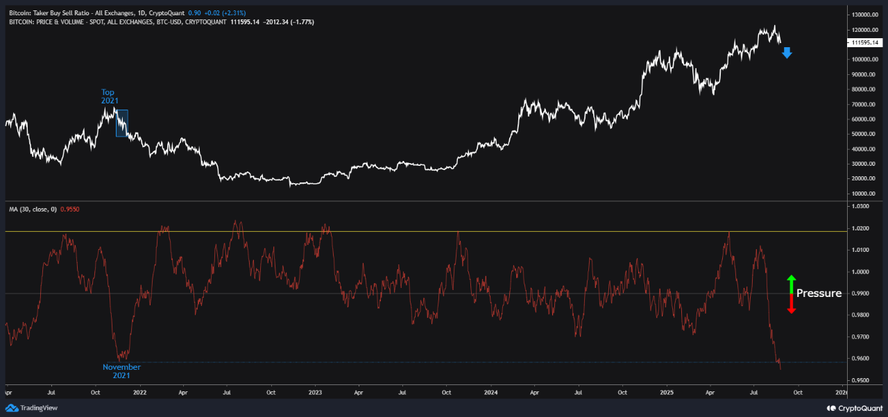 但另一项指标却发出矛盾信号。经30日平滑处理的比特币买盘卖盘比率不仅跌破长期均值,更逼近2021年11月以来的最低水平。当该比率持续低于1时,表明市价卖单数量压倒性超过买单。