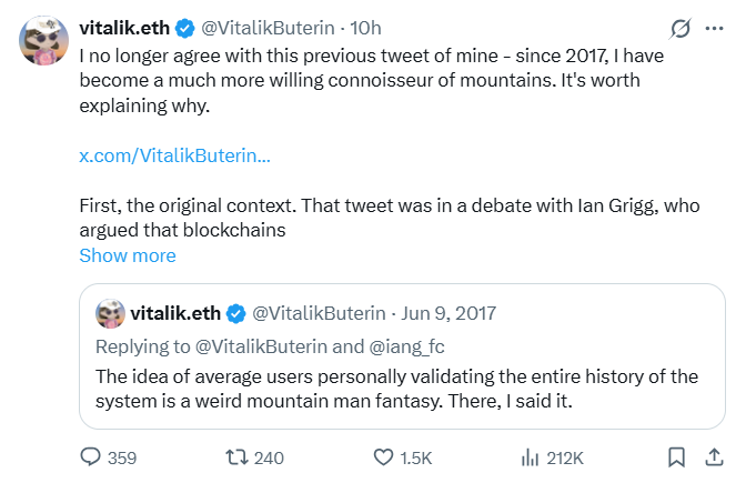 Vitalik Buterin引用了他2017年6月9日的一条旧推文。当时他说:"让普通用户亲自验证整个系统的历史记录,是一种奇怪的山民幻想。"