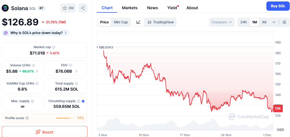 不过部分分析师仍坚持认为SOL是当前值得投资的加密货币。在月线下跌31%后,Solana价格目前在126美元附近徘徊。若多头能收复188美元的月内高点,则有望突破200美元关口,使其成为具备适度增长空间的潜力资产。