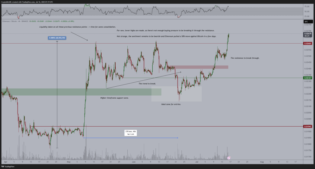 分析师Michael van de Poppe指出ETH/BTC汇率创新高,预示ETH未来看涨。