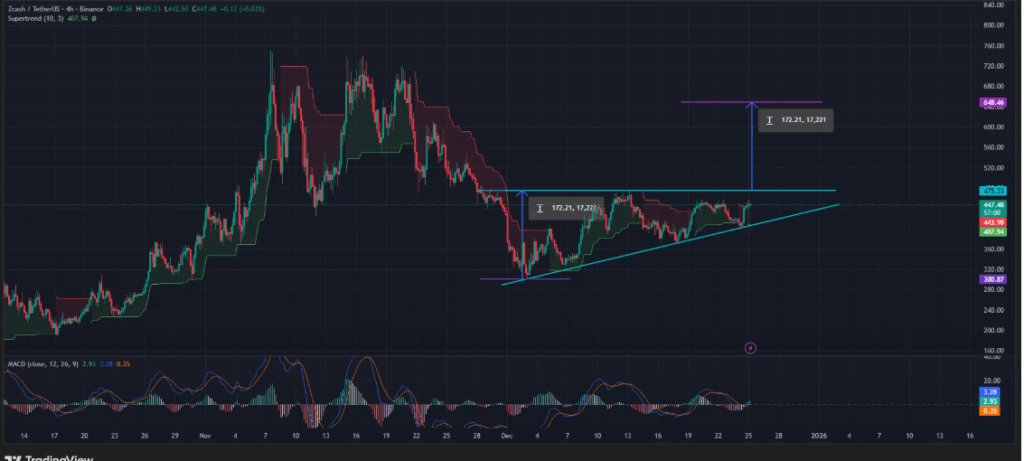 Zcash于周四录得10%的强势反弹,成功扭转本周早前跌势。虽然币价从周一454美元高点回落近10%,但多头坚守400美元支撑位后快速回升,截至发稿时交易于446美元附近。此番价格波动反映出市场买盘兴趣重燃,特别是相较于12月低点已实现45%的反弹幅度后。