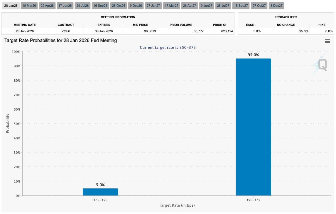 正如此前报道,市场已预期美联储将在1月会议上维持利率于当前水平。“基于最新数据,美联储将暂停降息。”Kobeissi对此予以确认。