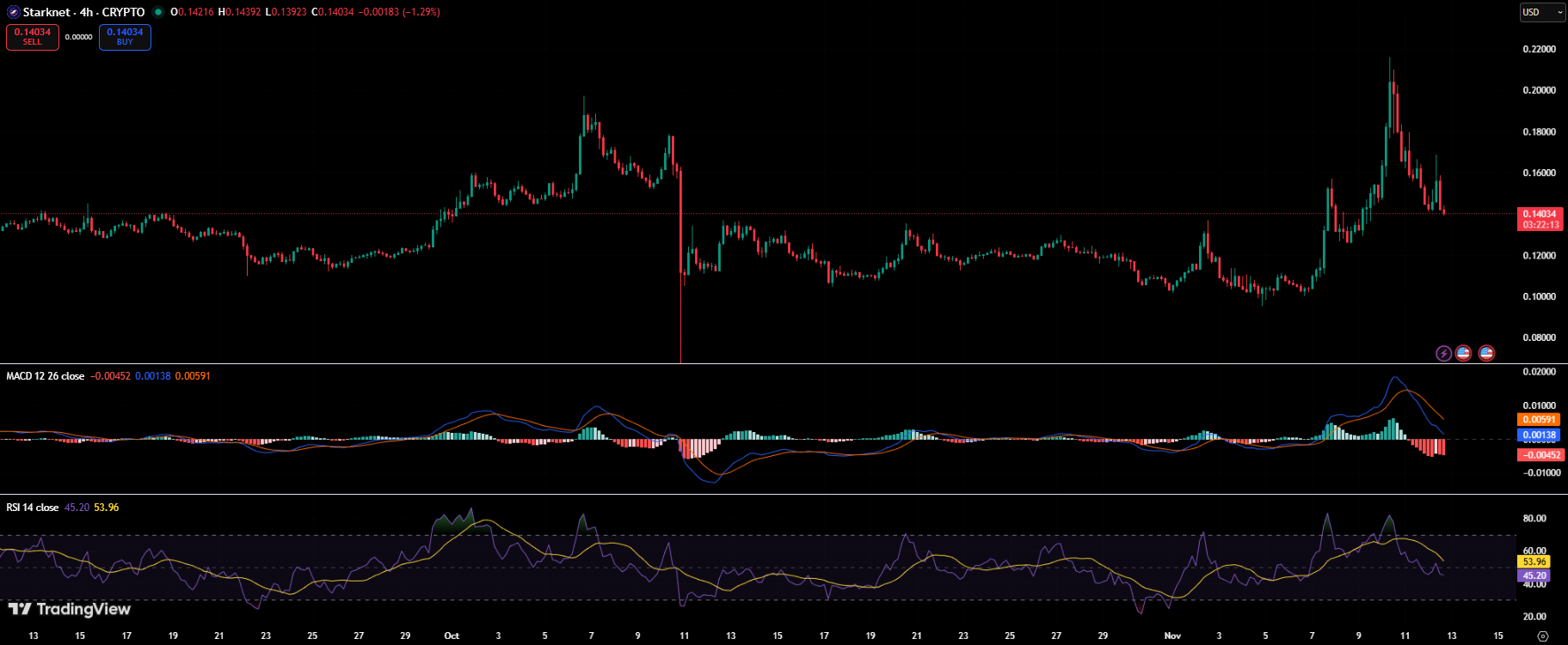 Starknet过去24小时下跌13.46%至约0.14美元,成为主流Layer2网络中单日跌幅最大的项目之一。技术图表显示动能减弱,RSI回落至45区域附近,MACD转为看跌。尽管周线仍有28%涨幅,但短期框架内抛压占据主导,表明交易者正在锁定上周突破后的利润。