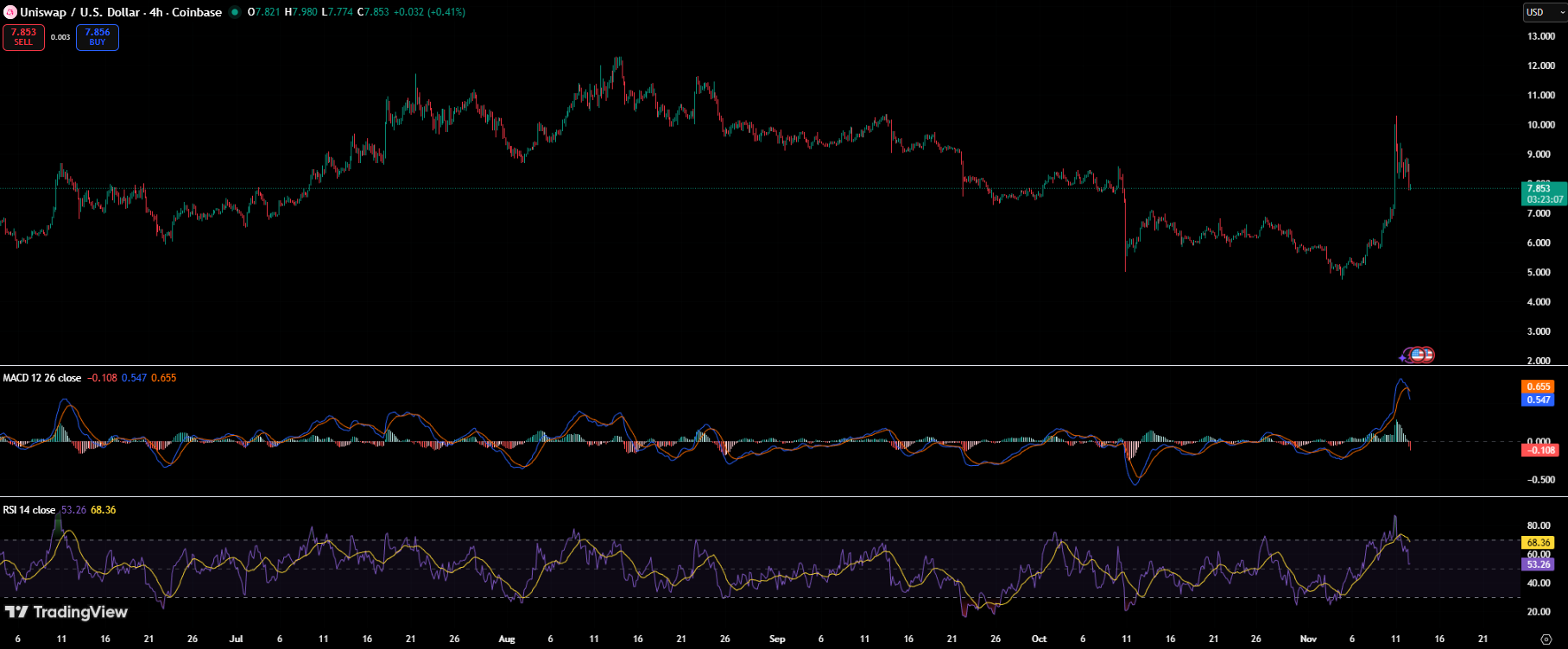 Uniswap在10美元阻力位测试失败后下跌10.94%至7.90美元。4小时图显示MACD出现明显死叉,同时RSI从接近超买水平回落至53左右,暗示买盘力量减弱。尽管出现下跌,UNI仍保持47%的周涨幅,其去中心化交易所生态链上活动的增长提供了支撑。