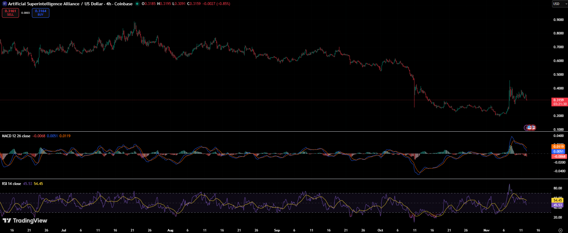 人工智能相关代币FET随整体AI概念降温下跌10.47%至0.317美元。MACD和RSI指标均确认了本月初强劲上涨后的短期回调。尽管出现下跌,该代币周线仍上涨45%,反映投资者对AI驱动区块链项目的持续兴趣。