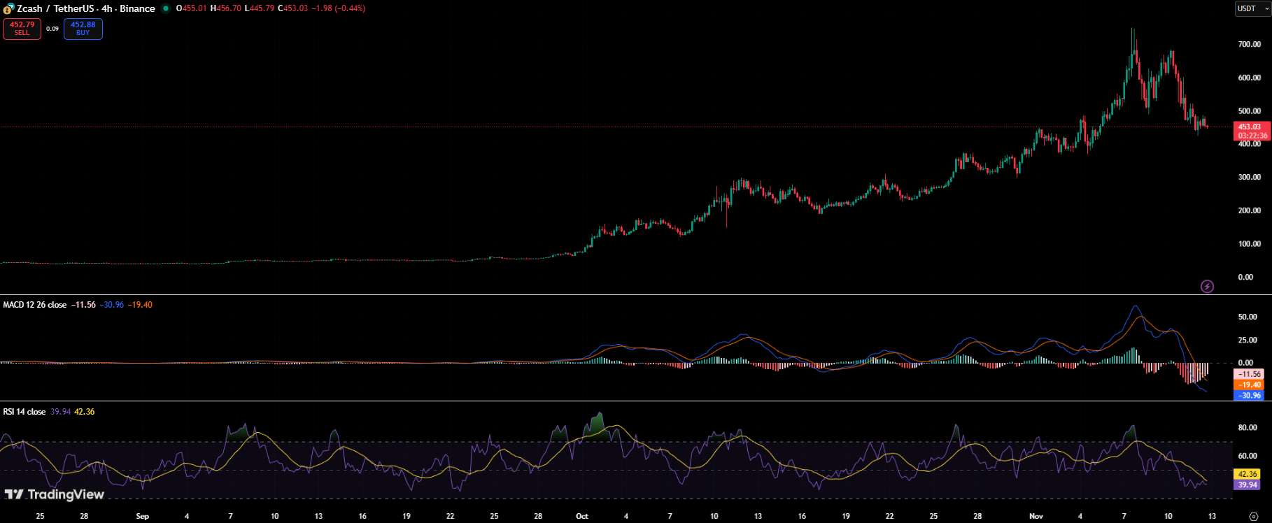 Zcash下跌8.74%至452美元左右,抹去了近期部分涨幅(价格曾短暂突破700美元)。MACD线急速跌入负值区域,RSI目前位于40附近,确认短期看跌阶段。分析师指出,本周获利了结和流动性紧缩正在打压隐私类资产。