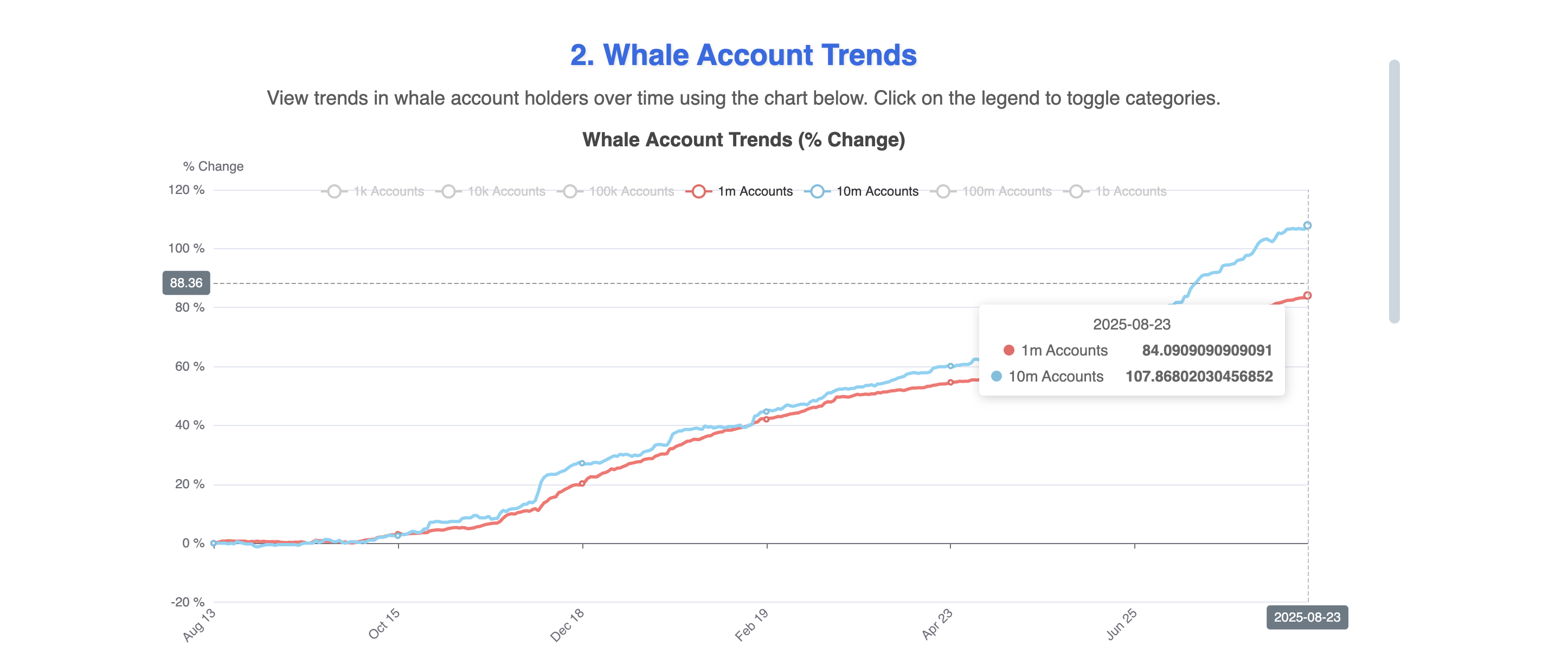 过去一周,HBAR大额持有者持续扩大持仓规模。持币量超100万枚的账户数量从8月16日的82.41个增至8月23日的84.09个;同期持币量超1000万枚的账户也从106.59个上升至107.86个。