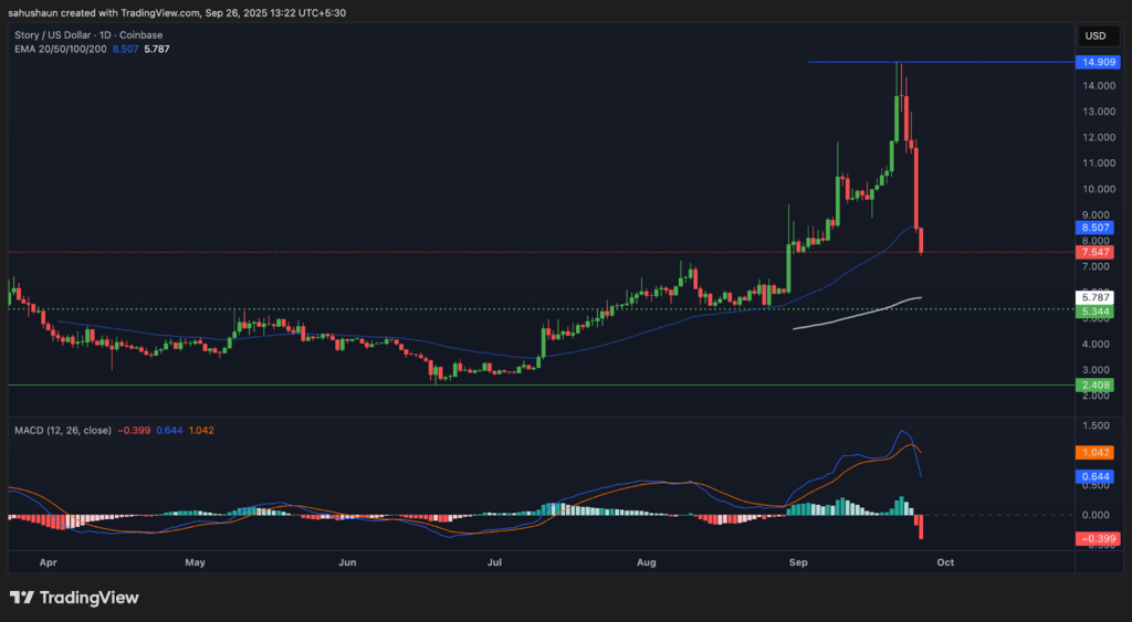 Story(IP)代币价格在日线技术图表上正面临极度看跌态势。价格已跌破50日指数移动平均线(EMA),目前正向200日EMA水平下探。过去24小时内,IP价格暴跌近25%,显示出空头已占据绝对主导地位。