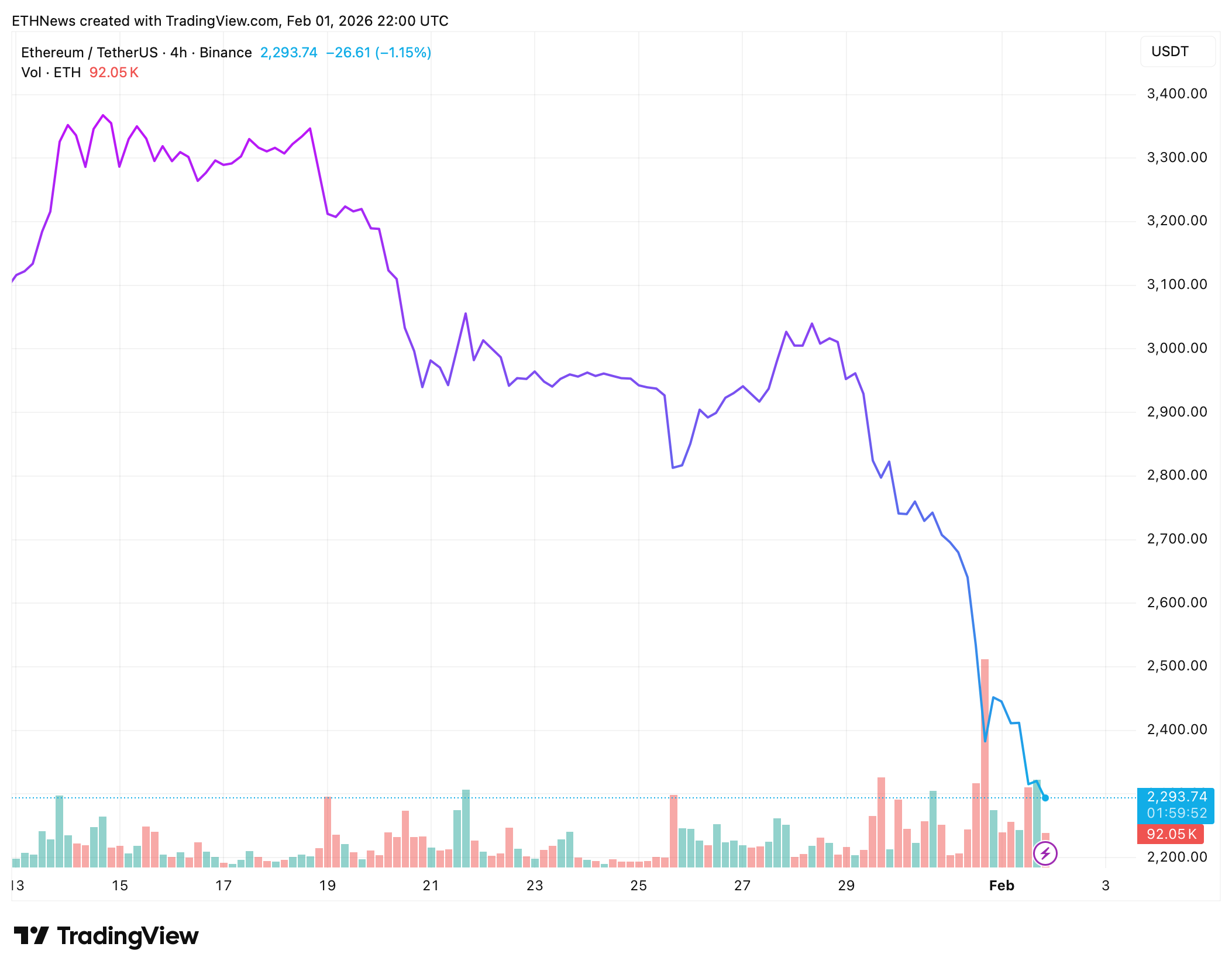 以太坊未能坚守在3000美元心理关口上方,该位置本是近几周来的关键技术支点。价格一旦失守该区域,下跌动能便迅速加剧。
