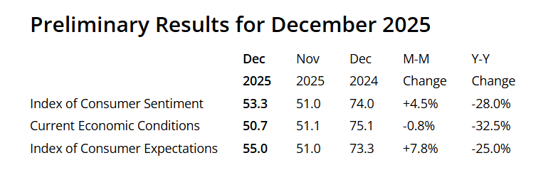 “总体而言,虽然现状评估变化不大,但预期指标有所改善。这种改善主要得益于个人财务预期13%的涨幅,且覆盖所有人口群体。然而12月的个人财务预期仍较年初下降约12%。同样地,劳动力市场预期虽略有改善,但仍维持在相对低位。”