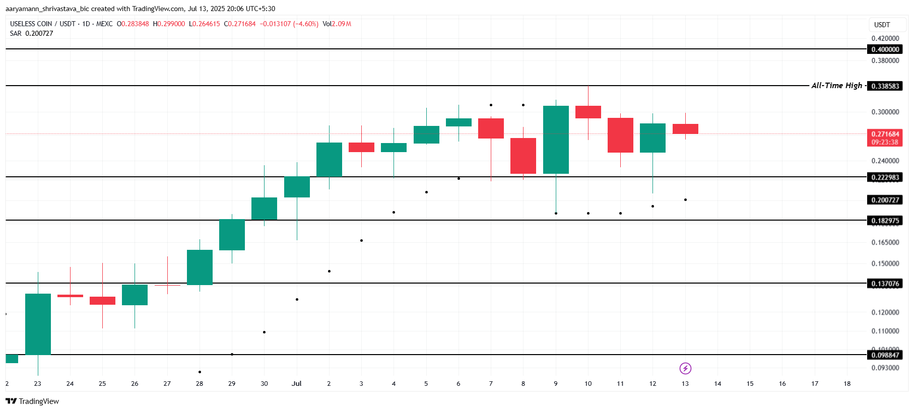 USELESS当前价格为0.271美元,在0.222美元与历史高点(ATH)0.338美元之间震荡。目前价格距ATH仍有25%空间,预示潜在增长机会。尽管本周走势平缓,抛物线转向指标(SAR)位于蜡烛线下方,暗示上行趋势可能延续。