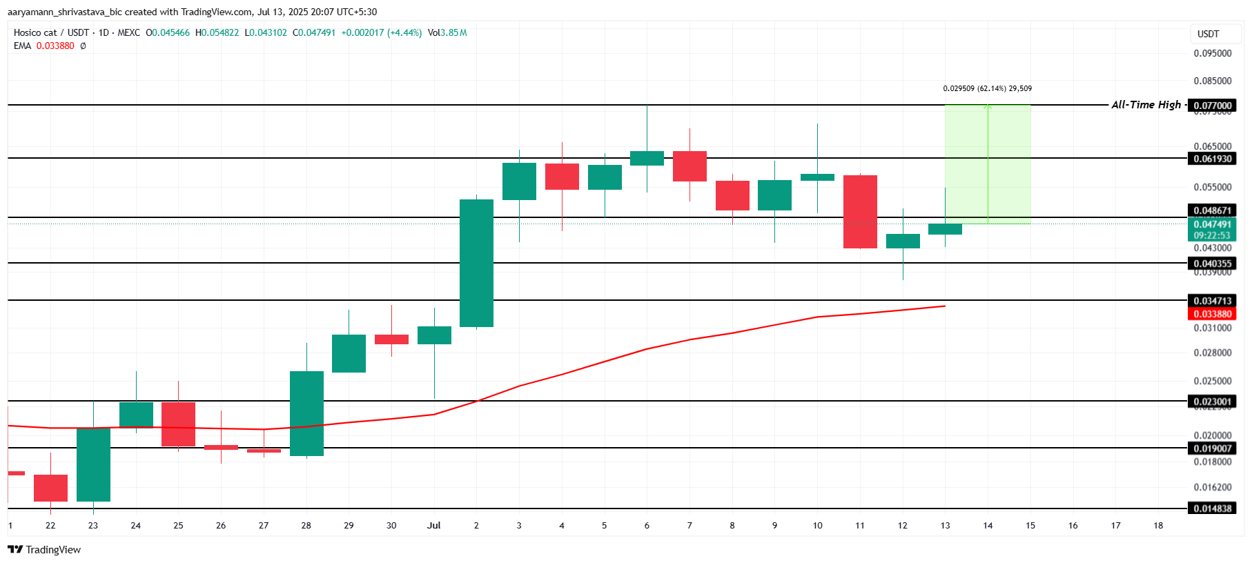 HOSICO上周创下0.077美元ATH后回落至0.047美元,现价距ATH相差62%。50日均线远低于现价,表明0.040美元支撑位或将保持稳固,代币可能逐步回升至前高。