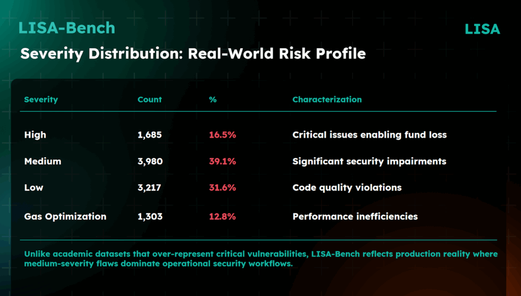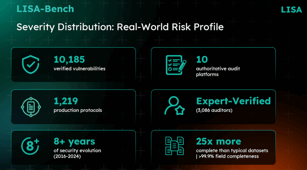 Anthropic团队采用仅包含413个漏洞合约的SCONE-bench数据集训练攻击模型,而AgentLISA的回应堪称碾压——LISA-Bench囊括了2016-2024年间23,959条经过专业验证的漏洞记录,成为有史以来最全面的智能合约漏洞数据集。其规模不仅是SCONE-bench的60倍,更包含10,185个完整代码案例,为AI训练提供的有效数据量超出竞争对手25倍。