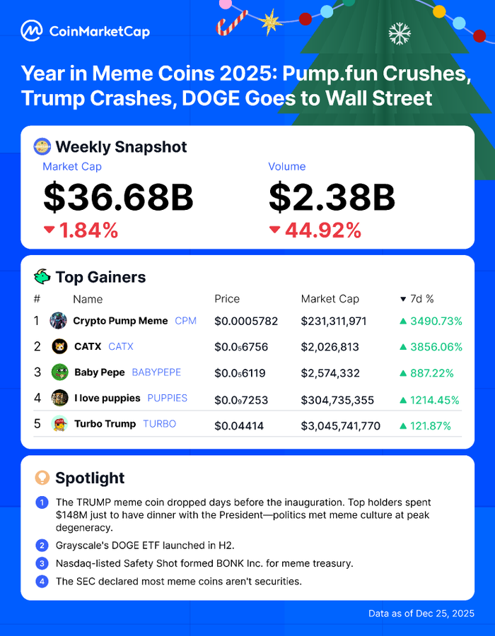 2025年的模因币板块以极端反差收官,一边是爆炸式上涨的赢家,一边是急剧萎缩的市场活跃度。CoinMarketCap发布的数据描绘了这样一个市场:它在文化层面依然具有强大影响力,但随着年终临近,资金选择却愈发挑剔。
