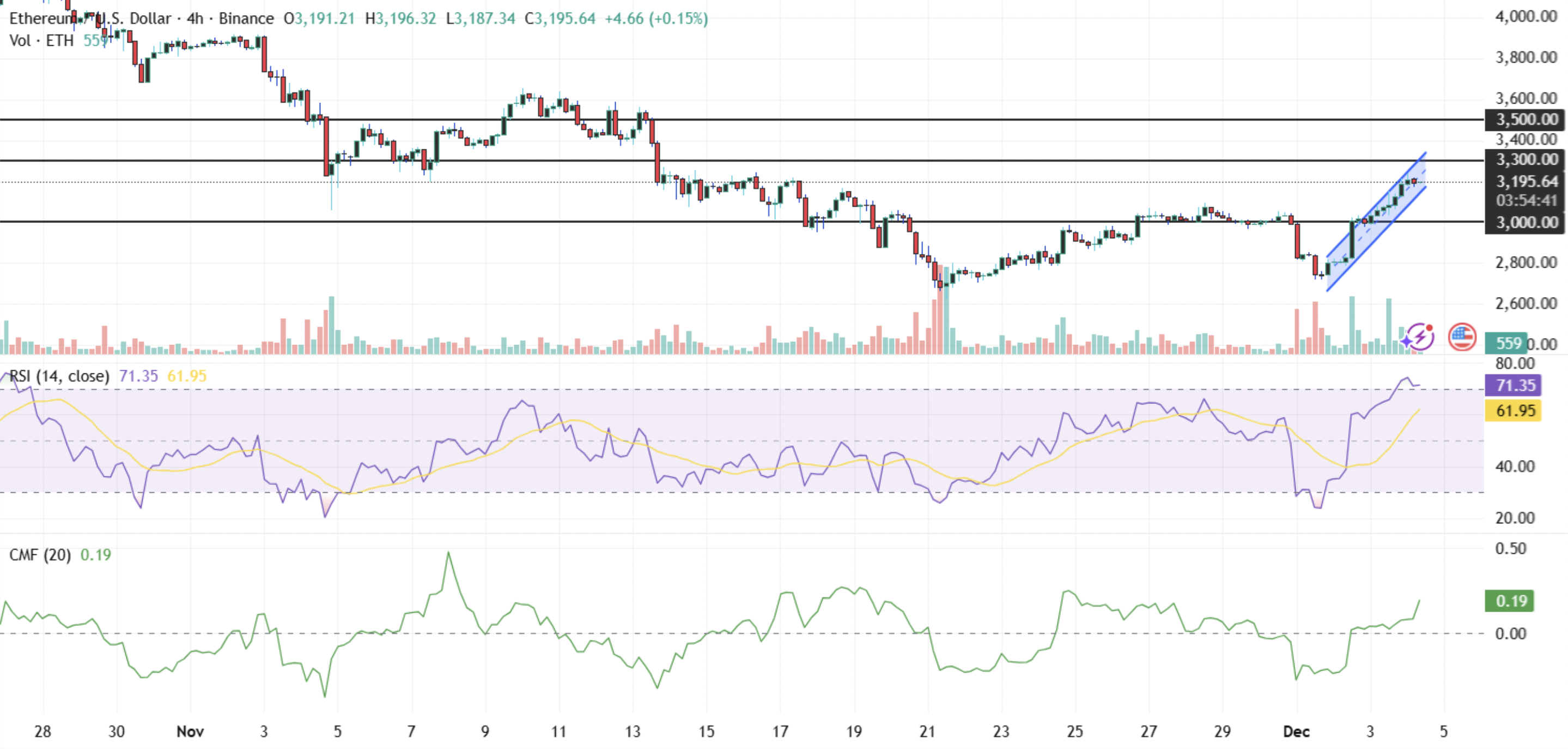技术指标同样支撑上涨趋势。相对强弱指数(RSI)已达71进入超买区间,而资金流量指标(CMF)维持在0.09。当前技术数据表明买盘压力持续存在,有望推动价格进入3300-3500美元区间。